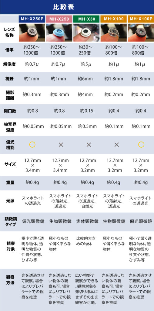 またMH-X100は、観察対象がなるべく平らなものである必要があり、場合によってはプレパラートの使用をおすすめします。